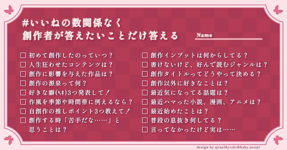 今日ブルスカで流したテンプレバナー 創作者に聞きたいことをリスト化しました 蝶々のあしらいはブルスカにちなんでる 皆時間ある時に答えたいことだけ教えてくれ~~!!! 2025.03.09(Sun) 19:32 日記,デザイン